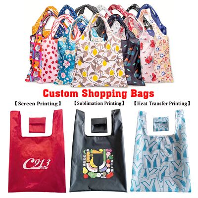 Süpermarket ve perakende uygulamaları için özel logo baskılı toptan polyester katlanabilir alışveriş çantaları.